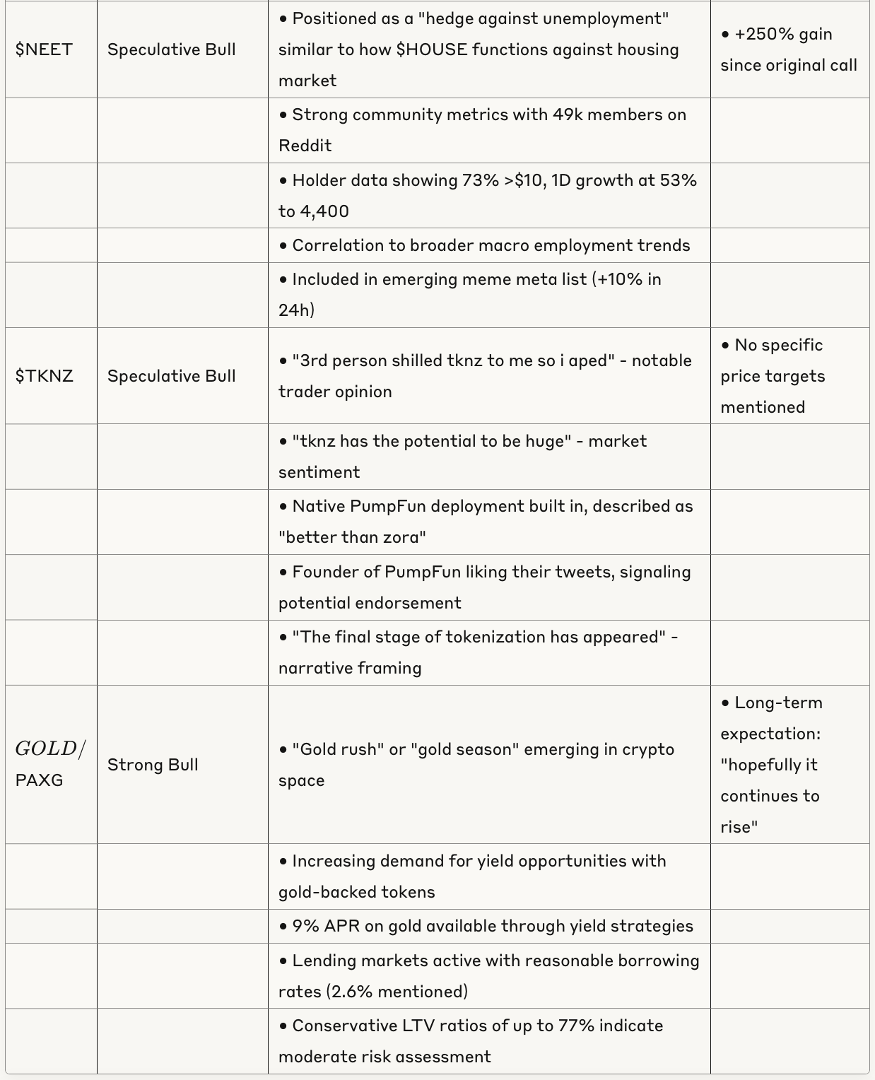 A "gold rush" or "gold season" is developing in the DeFi space, with growing interest in gold-backed tokens and yield opportunities. This trend is driving development activity with "200 plus new stable coins" mentioned. Lending markets for gold-backed tokens are active with reasonable borrowing rates (2.6% mentioned) and conservative LTV ratios of up to 77%, indicating moderate risk assessment in the sector.