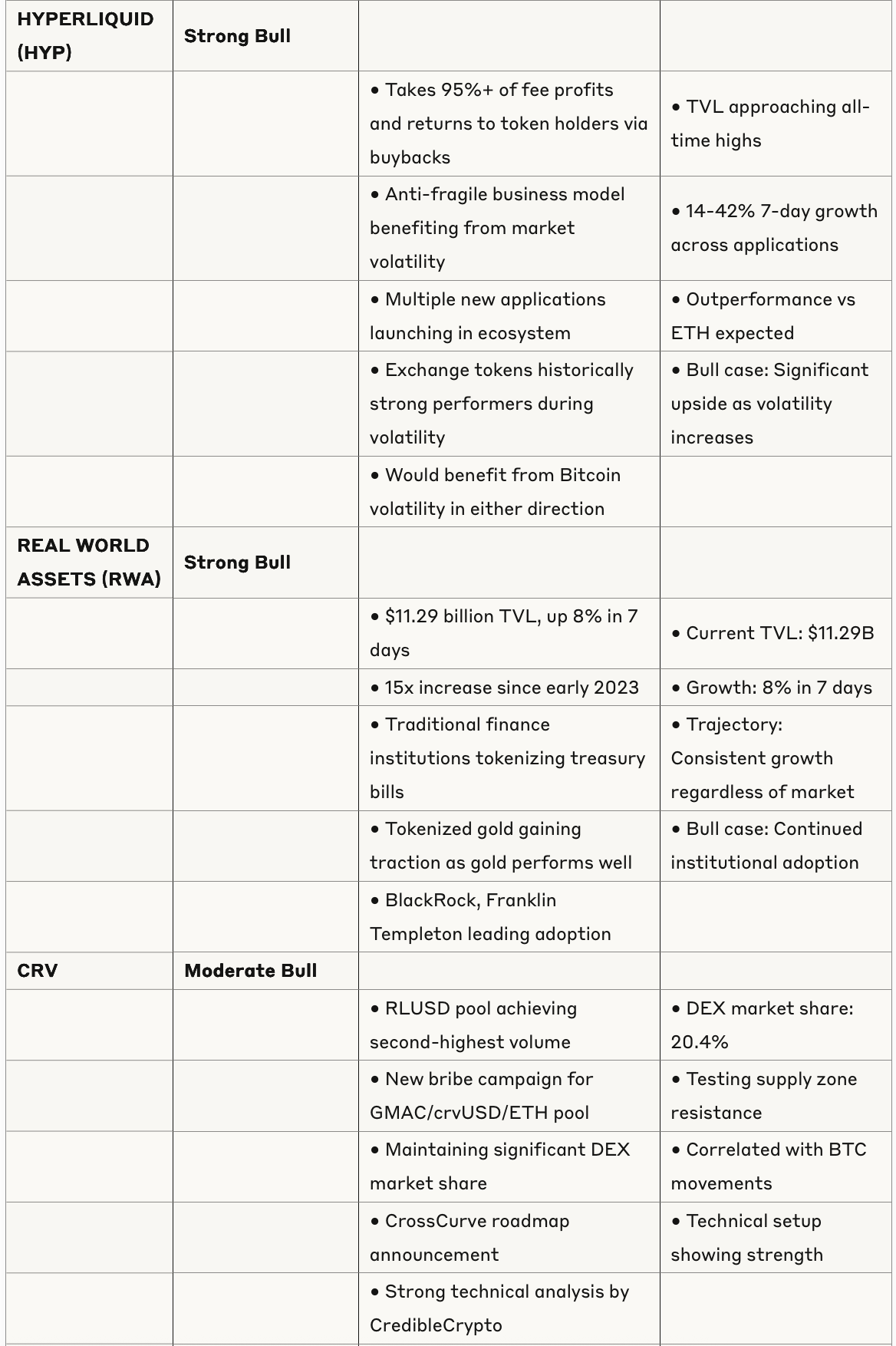 The crypto market shows a complex landscape with selective strength in specific sectors rather than broad-based bullishness. Bitcoin faces a critical test at $90-95K resistance, while Ethereum continues to underperform significantly. HYPERLIQUID and Real World Assets stand out as strong bullish opportunities with fundamental growth regardless of market conditions. Risk management remains paramount with positioning advice suggesting maintaining significant cash reserves (20-40%) and avoiding over-concentration in any single asset.