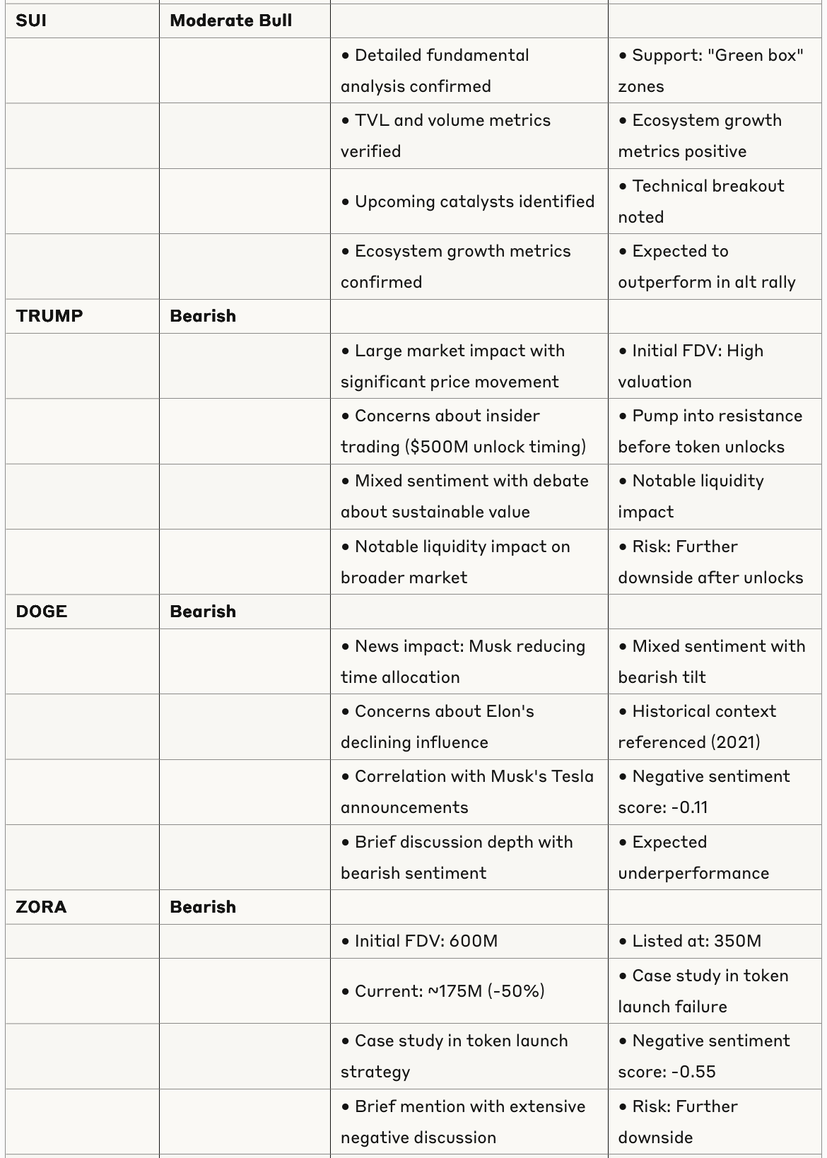 TRUMP and DOGE face bearish sentiment with specific catalysts driving negative outlook. TRUMP faces concerns about insider trading with $500M unlock timing, while DOGE suffers from news about Musk reducing his time allocation. Both tokens show mixed to negative sentiment scores and are expected to underperform the broader market.