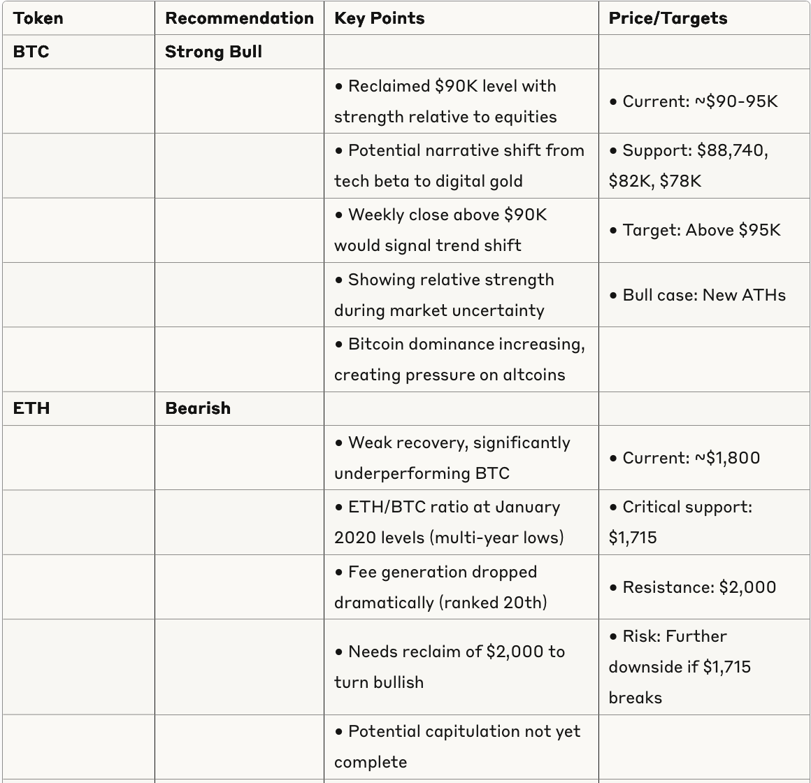 Bitcoin shows strength at a critical resistance zone ($90-95K), with potential for a significant move if weekly closes above $90K occur. The narrative shift from tech beta to digital gold appears underway, with Bitcoin showing relative strength versus equities during market uncertainty. Ethereum continues to underperform, with the ETH/BTC ratio reaching multi-year lows and fundamentals weakening as fee generation drops dramatically.