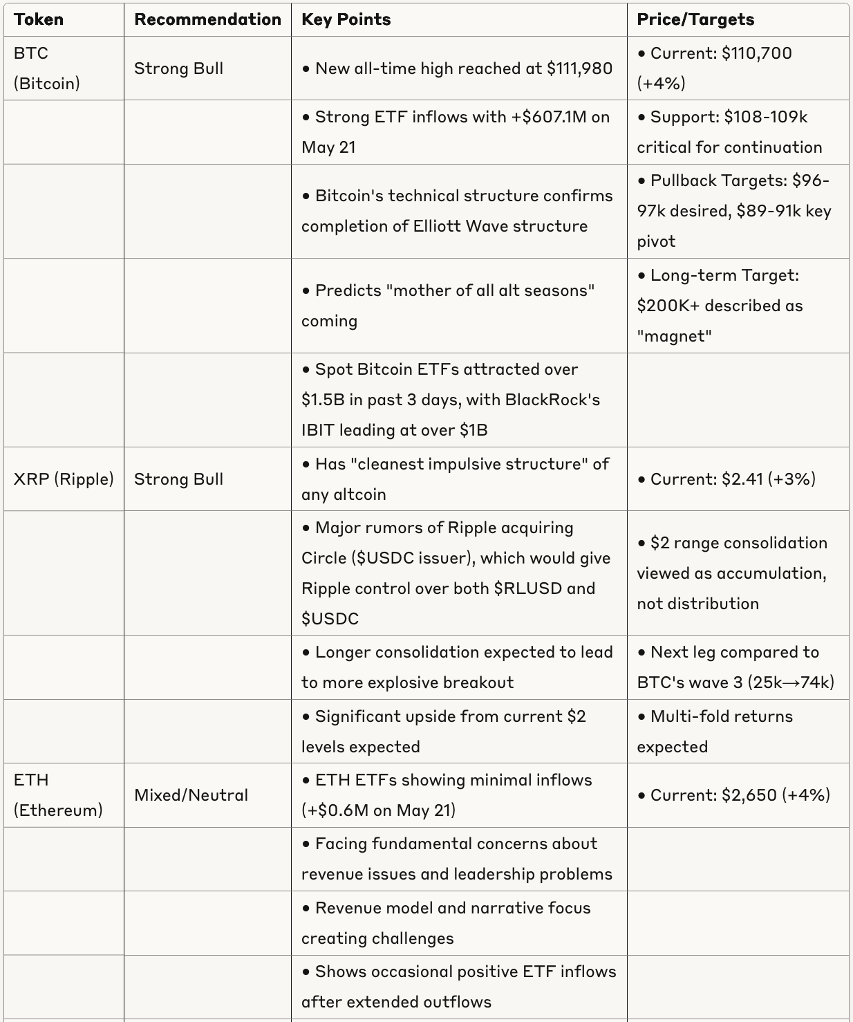 The crypto market is currently in a strong bullish phase, with Bitcoin reaching a new all-time high of $111,980. Bitcoin has seen a 4% increase to $110,700, while Ethereum is up 4% at $2,650, XRP up 3% at $2.41, and SOL up 5% at $178. With a market cap of $2.19 trillion, Bitcoin has become the fifth-largest asset globally, surpassing Amazon. BTC ETFs showed strong inflows with a total net daily flow of +$607.1M for May 21, 2025.