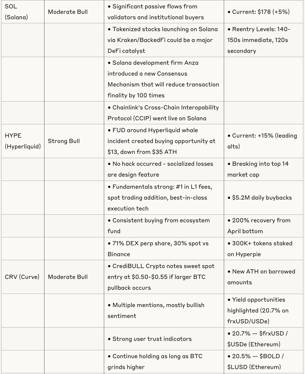 The market shows signs of a maturing ecosystem with significant institutional involvement, continued technical strength, and evolving narratives that bridge traditional and crypto finance. While Bitcoin continues to lead with new all-time highs, the stage is being set for altcoin outperformance, with particular strength in established DeFi protocols, innovative platforms, and strategic project acquisitions.