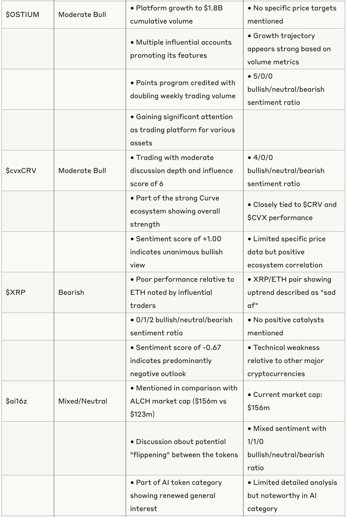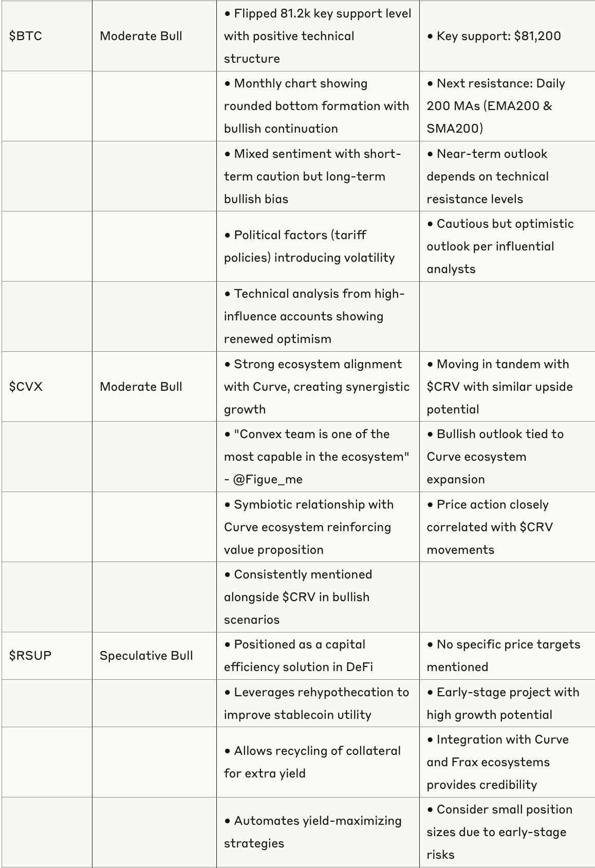 The current market phase rewards quality projects with strong fundamentals while punishing speculative assets without clear utility. The Curve ecosystem stands out as particularly strong, with multiple tokens showing significant growth and positive sentiment. Bitcoin maintains a moderately bullish outlook with key technical levels being reclaimed, while Ethereum faces challenges that require fundamental improvements.