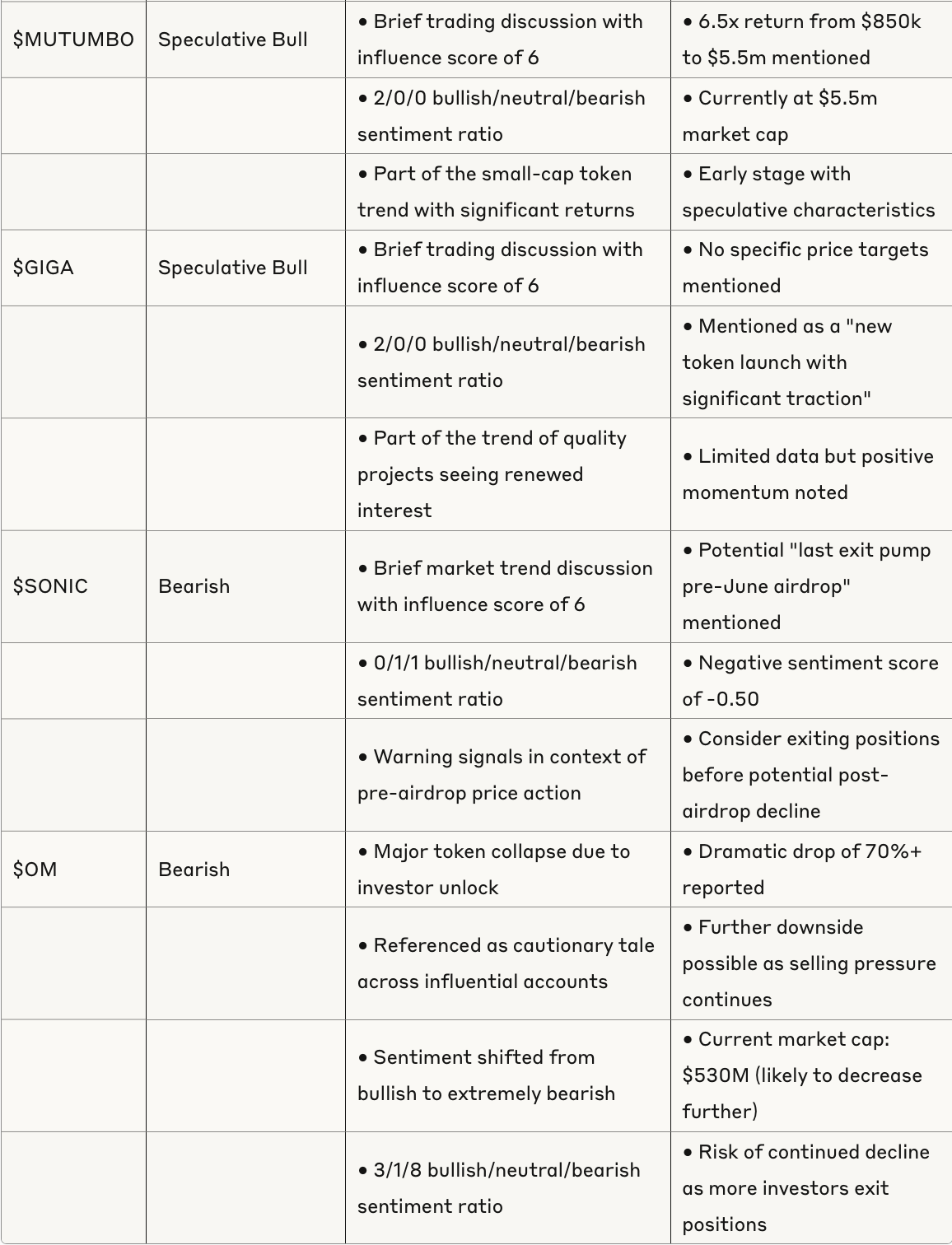 Token Analysis Table