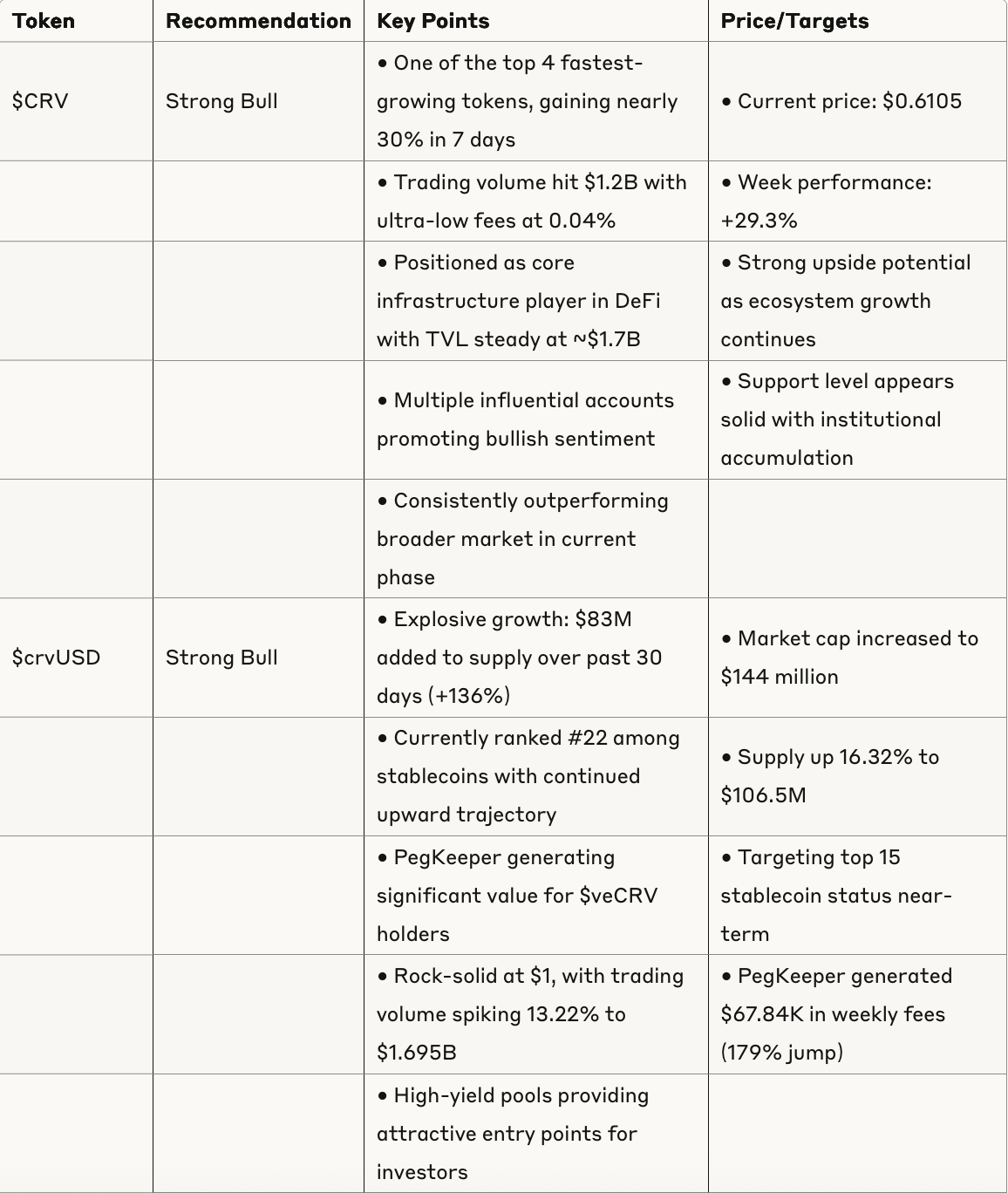 The Curve ecosystem ($CRV, $crvUSD, $CVX) shows exceptional strength with multiple tokens experiencing significant growth